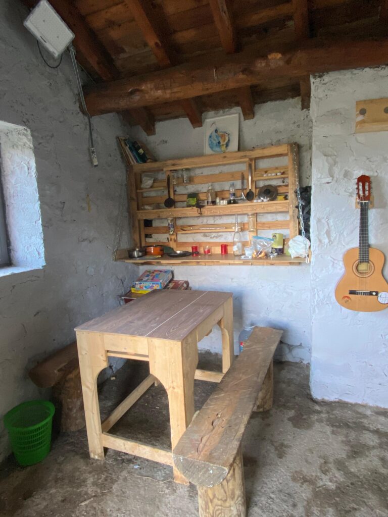 El Refugio está equipado, cuenta con una mesa, bancos, algún utensilio de cocina y un foco alimentado por un panel solar.