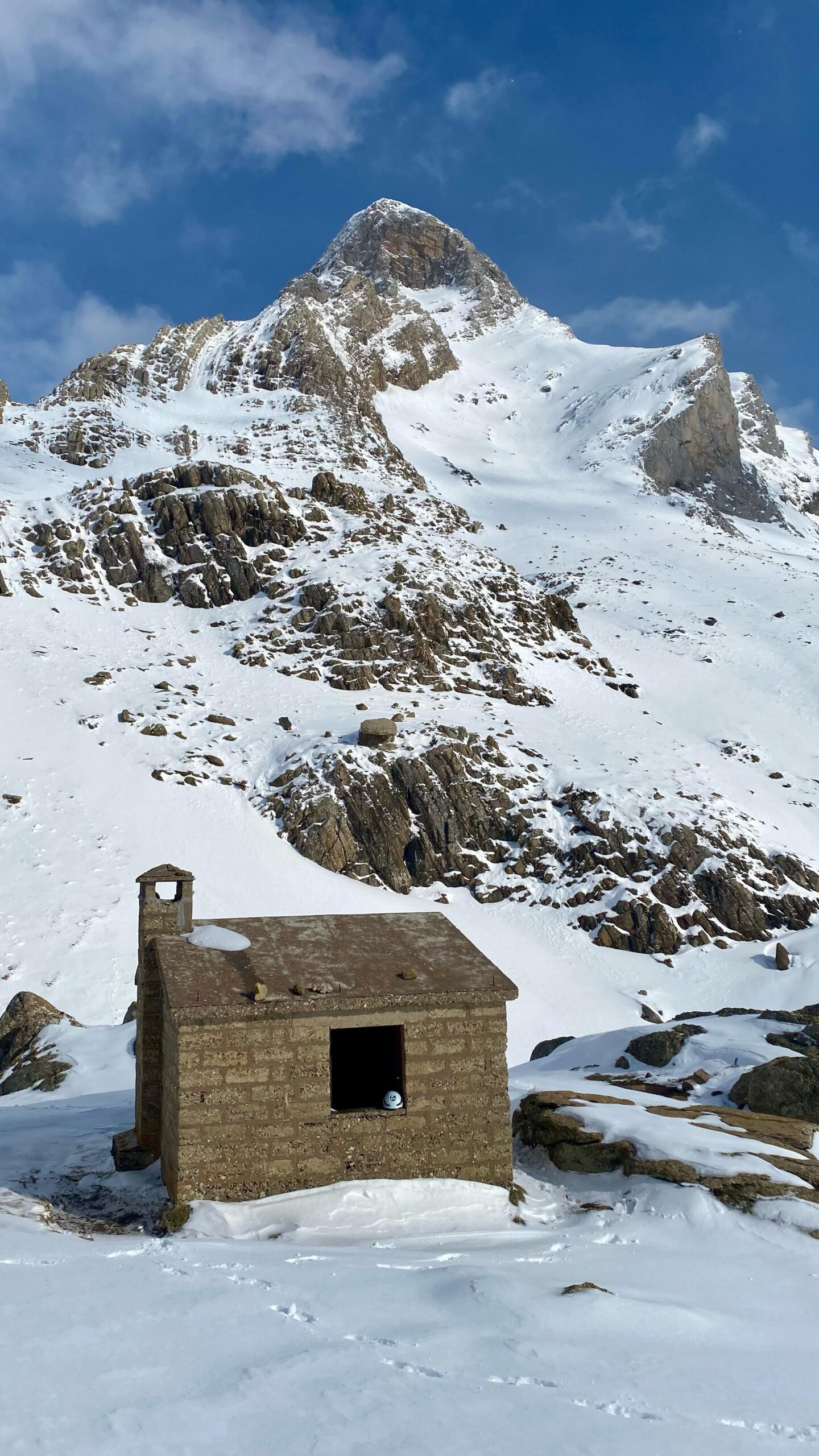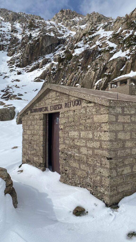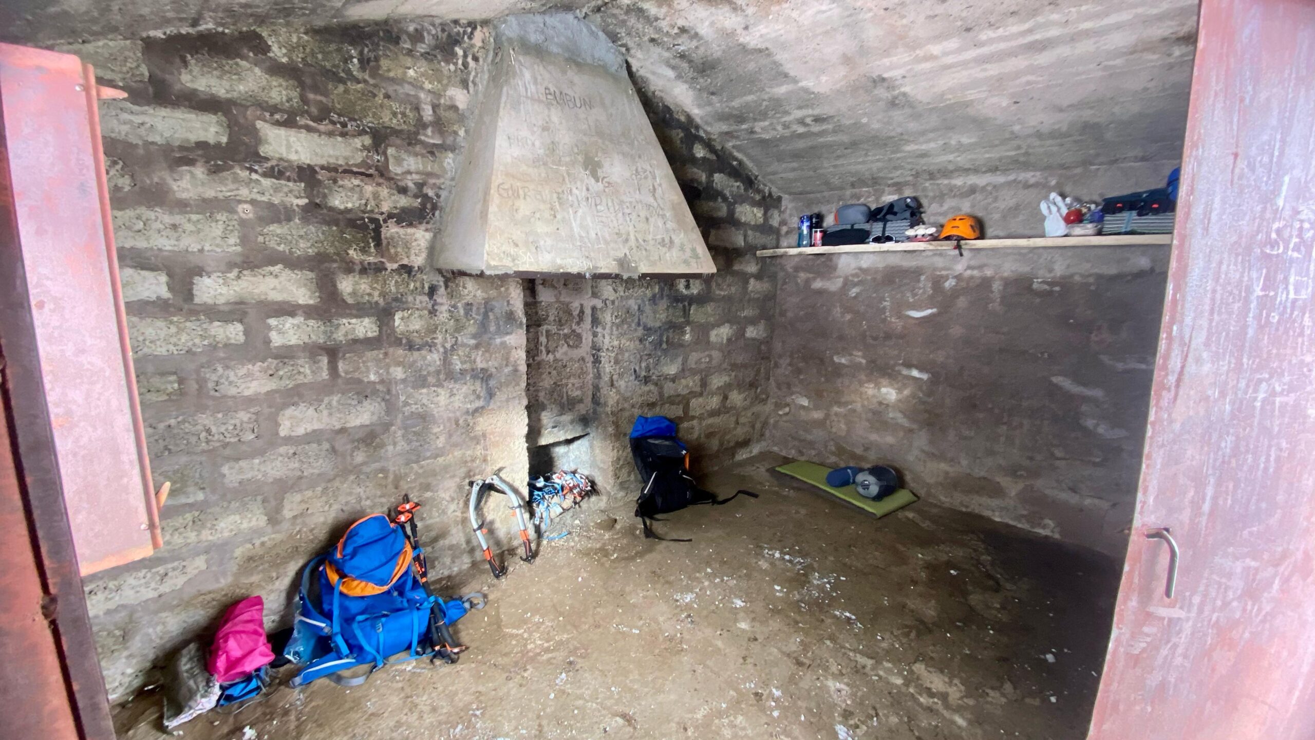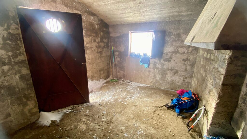 No hay ningún tipo de estructura para dormir, así que hay que hacerlo al raso… conviene llevarse esterilla y saco. Desde dentro se puede cerrar bien con el pestillo, aunque se complica hacerlo desde fuera y tiende a quedarse abierto (entra un poco de nieve e incluso algún animal buscando abrigo o comida).